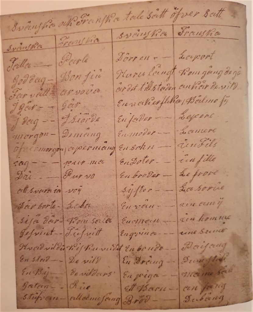 Om vi idag tycker att engelskan tränger sig in i vårt språkbruk är det ingenting mot hur franskan användes på herrgårdarna under 1700-talet. Många låneord införlivades i svenskan och Johan Adam Drakenbergs dagboksanteckningar är full av exempel på detta. Redan i första stycket på första sidan använder han ord som momenter, arrengement, affairer. Det hindrade inte att han ville bättra på sin franska hos “Språkmästaren” Antoine respektive Lachou under sin vistelse i fransk fångenskap. På den Västgötska landsbygden där han växt upp var det kanske lite si och så med franskaundervisningen.
