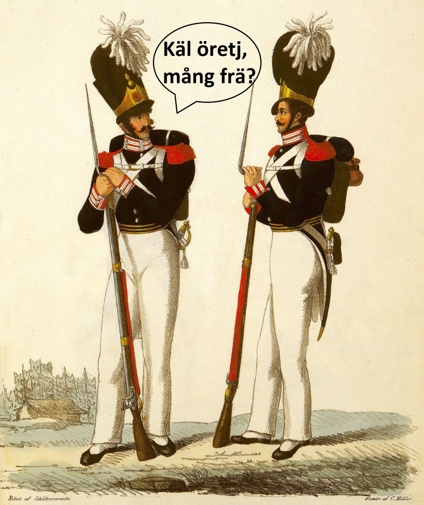 Soldaterna bör ha haft goda förutsättningar att göra sig förstådda även om det säkerligen krävdes tålamod på båda sidor. Här följer ett urval av Nils Råss glosor. Hans stavning fångar i flertalet fall skapligt väl ett korrekt uttal. Kolumnen till vänster, ”korrekt stavning” har jag lagt till.