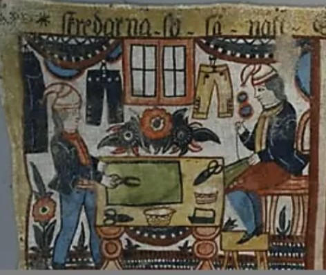 Bonad målad av Anders Pålsson 1826 som föreställer nio olika hantverksyrken. Här syns skräddaren. Fotograf: Hallands kulturhistoriska museum.